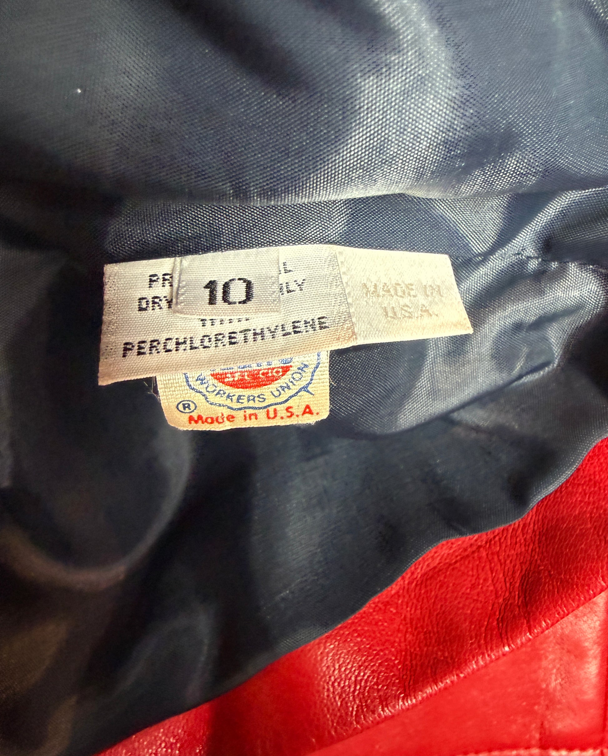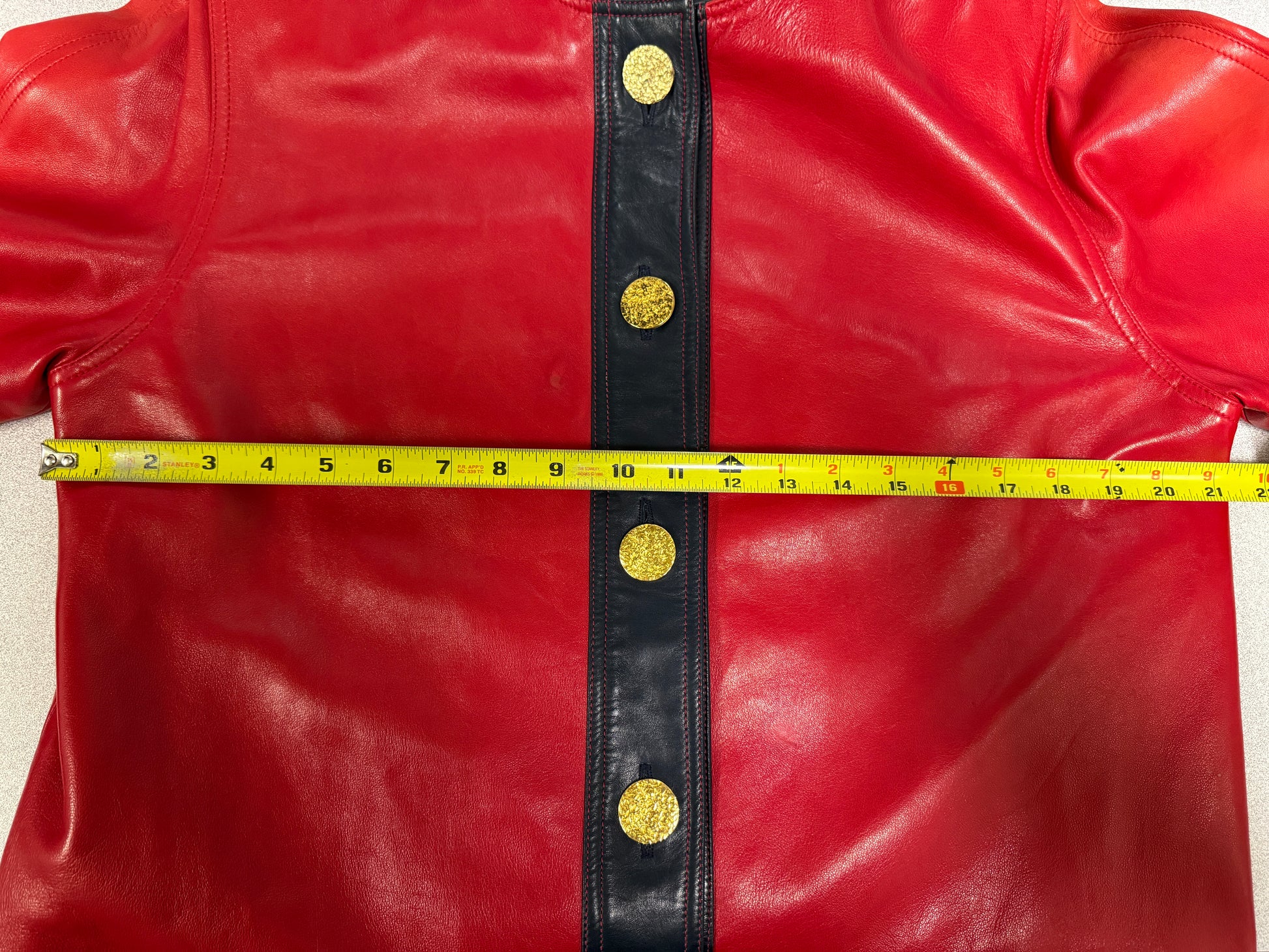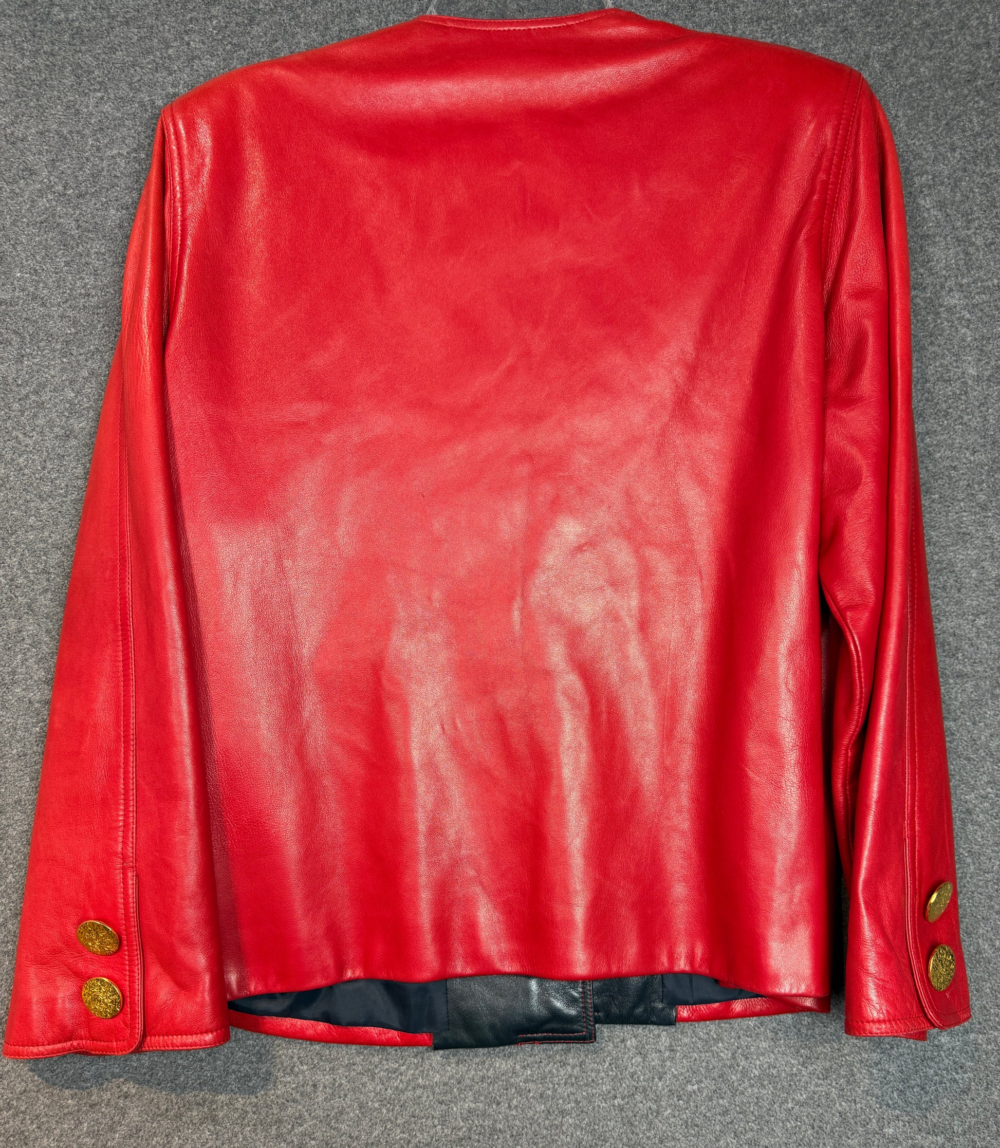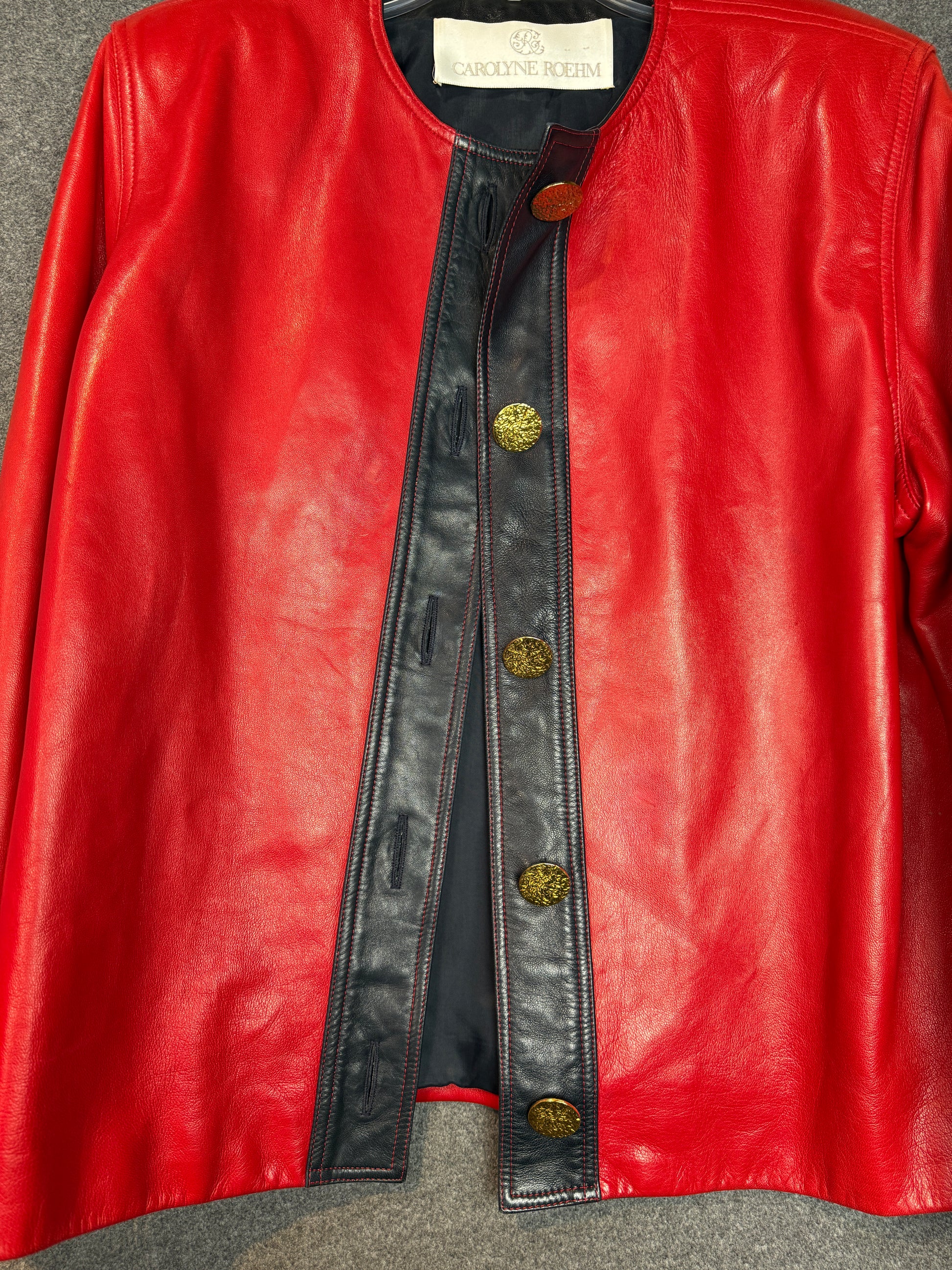 A distinguished Carolyne Roehm design in supple red leather with contrasting black detailing and polished gold closures. This pre-owned jacket exhibits expected signs of wear consistent with vintage leather goods, localized surface marks and minor shoulder discoloration. Size 10. Made in U.S.A.