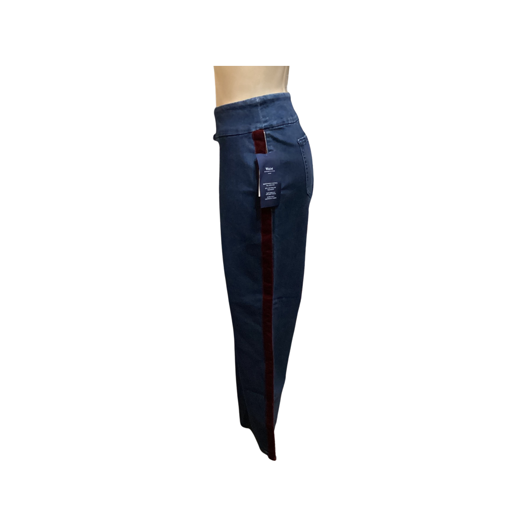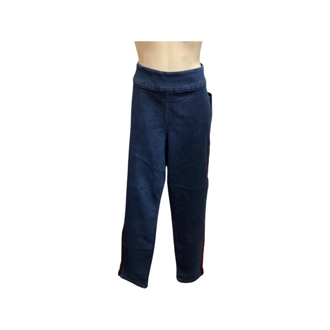 Women's cambridge skinny ankle jean with a red velvet strip pull on.