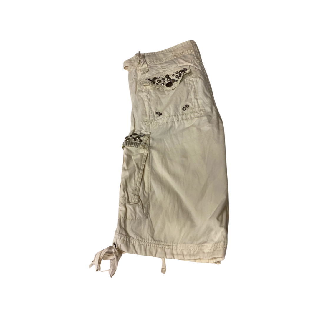 Details: metal stud and bead work on pockets, drawstrings, floral print on inside. Gray and white stitch design on pockets.