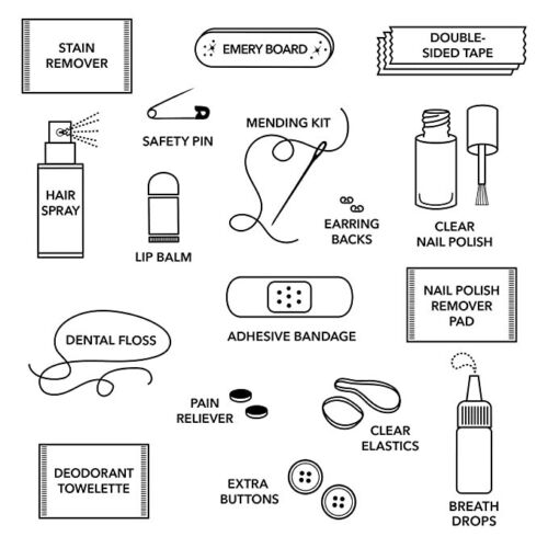 This Velvet Minimergency Kit for Bridesmaids with matching scarf pulls contains 21 essentials: Hair spray, clear nail polish, nail polish remover, emery board, earring backs, clear elastics, mending kit, safety pin, double-sided tape, stain remover, deodorant towelette, pain reliever, tampon, breath drops, dental floss, adhesive bandage, facial tissue, blotting tissues, bobby pins, antacid, and extra wedding bands.