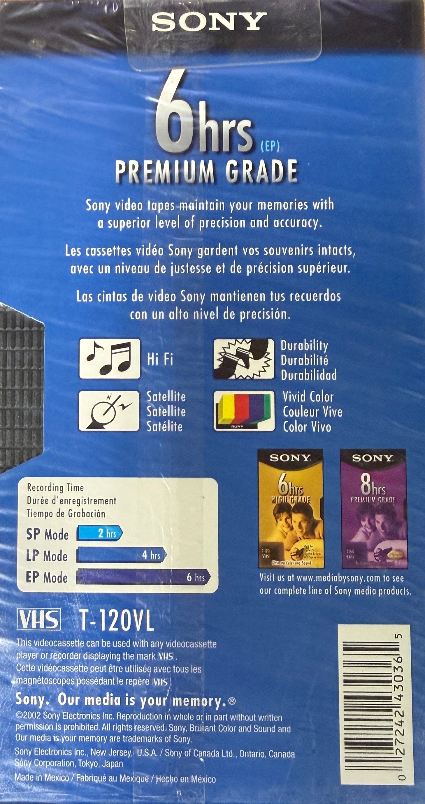 Sony T-120 6-hour blank VHS tapes, premium grade for crisp picture and clear sound. Perfect for recording TV shows, home movies, or archiving old footage, with durable construction to resist dropouts and wear. Compatible with all standard VHS VCRs