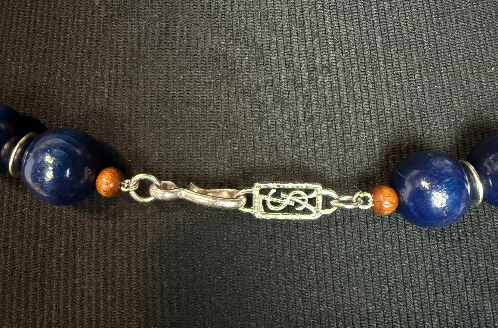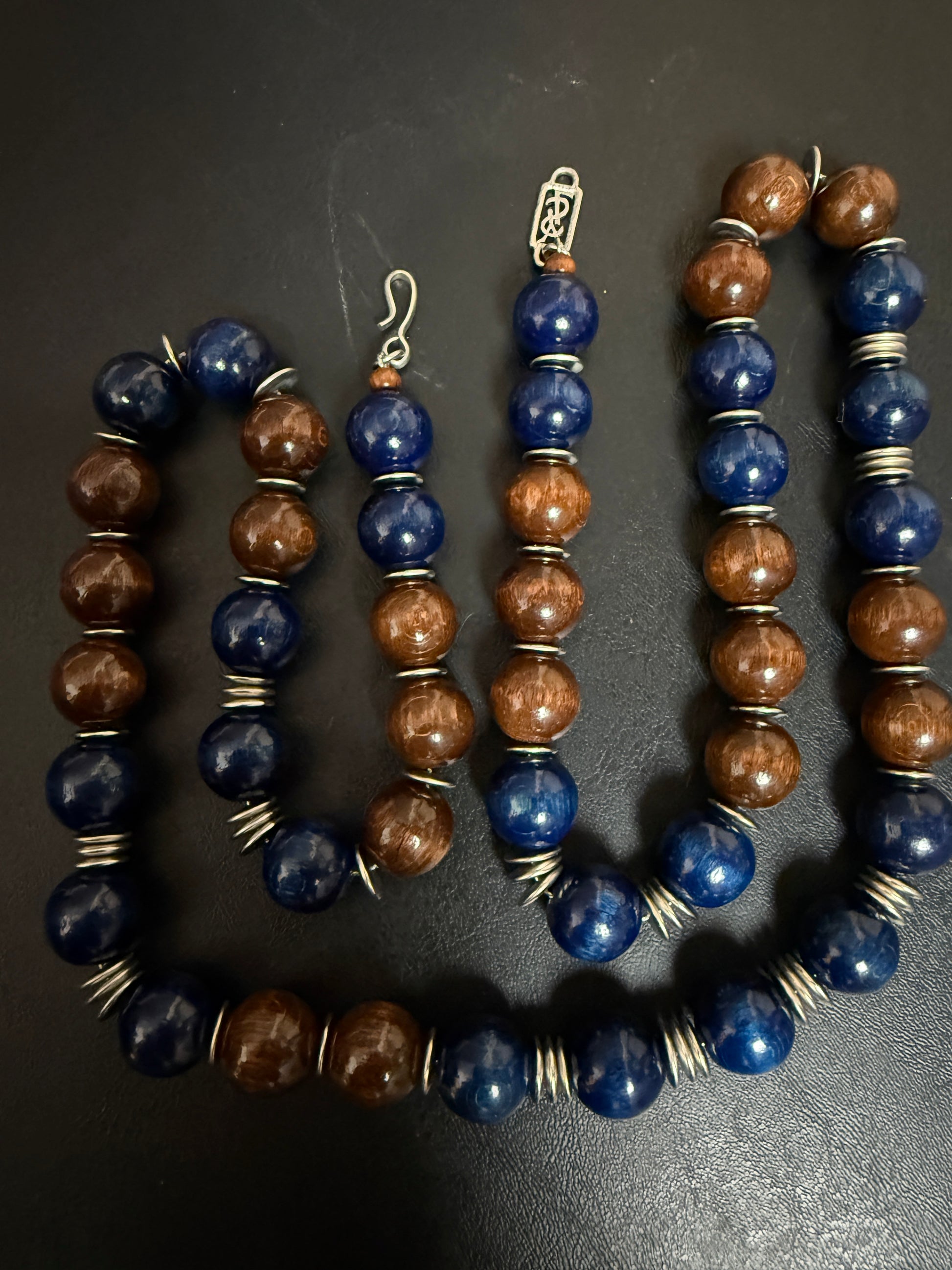 This vintage YSL necklace features a striking combination of brown and blue wooden beads accented with silvery details, stretching 37 inches for versatile styling. The rich, deep tones reveal their full vibrancy under natural light, while maintaining an understated elegance in softer settings.